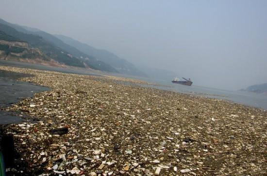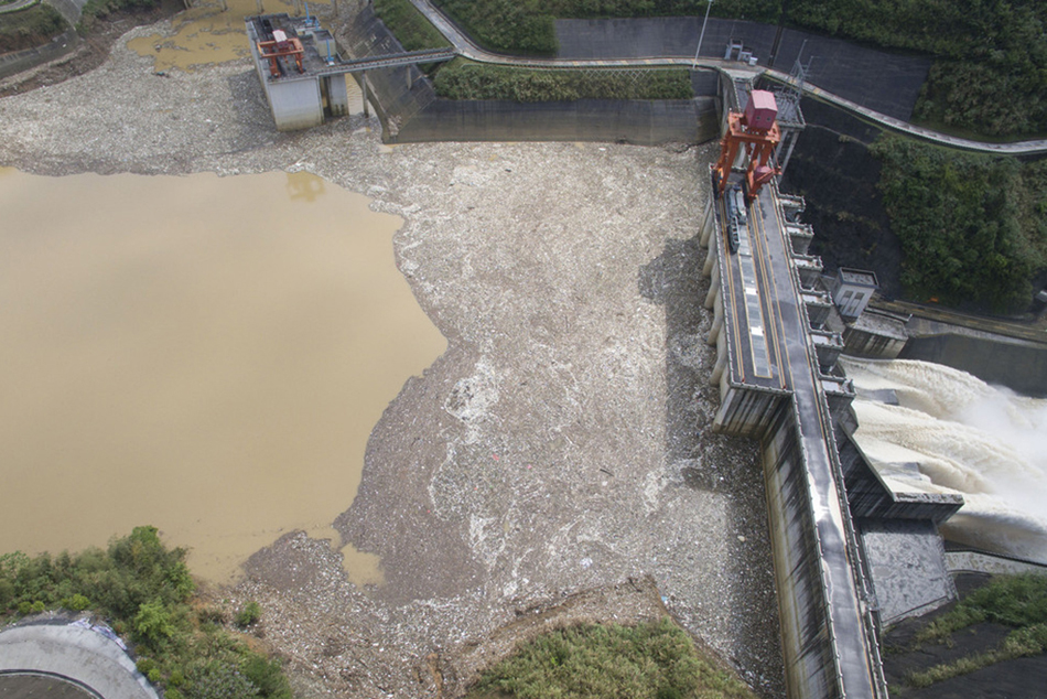 前,形成大片厚厚的垃圾層,竟將兩艘失控漂到進水口前的駁船抬起,進水口攔污柵嚴(yán)重堵塞,水頭差達9米,二江水電7臺機組被迫停機15小時,損失發(fā)電量1000多千瓦時,大量漂浮物涌向攔污柵,攔污柵隨時都有被推倒的危險,直接威脅到機組的安全。