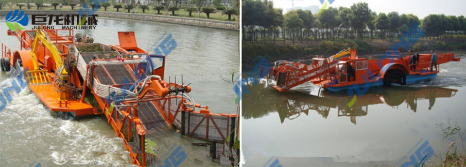 1、巨龍多功能藻類收集船安裝有機械化收集臂,橫向刀具和機械化的收集艙。具有收集藻類,切割水草,收集水葫蘆和打撈漂浮垃圾的功能。