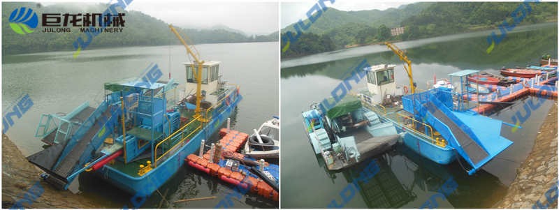 1、巨龍河道保潔船主要用于打撈浮萍,水葫蘆和其他漂浮垃圾。位于前艙的收集鏈安裝有吊鉤,收集水草效率高。